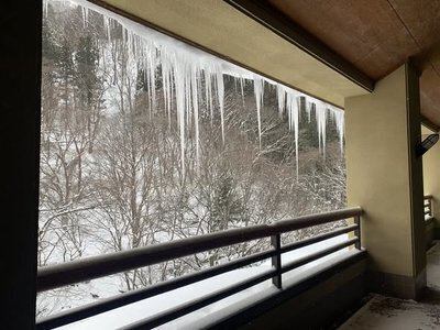 先日からの雪と連日の寒さで、ラウンジの氷柱が成長しました!